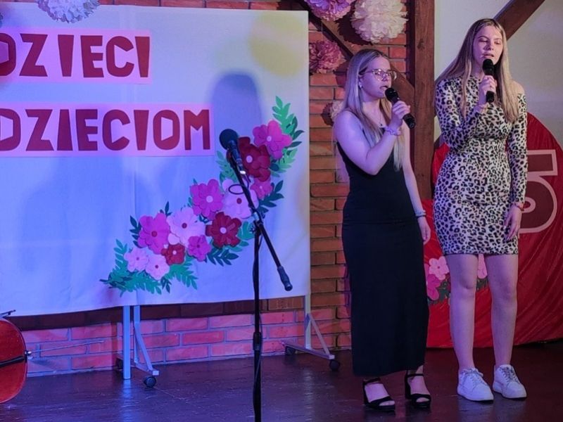 • Dwie dziewczyny na scenie, śpiewające przez mikrofon na tle plakatu z napisem Dzieci-Dzieciom
