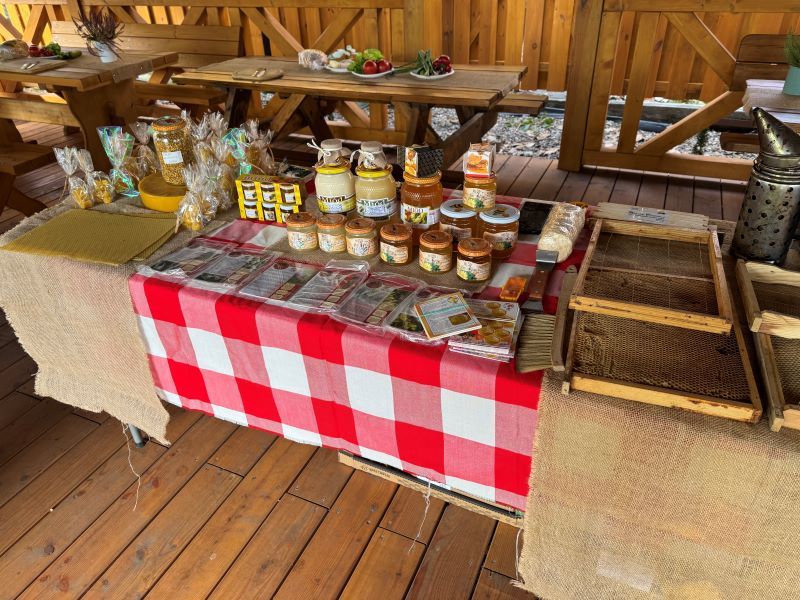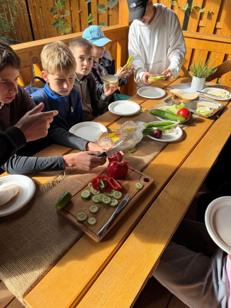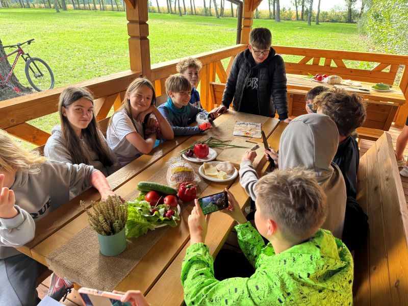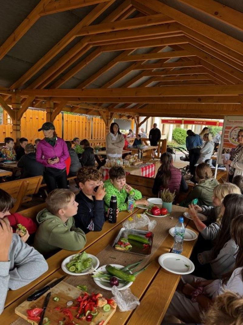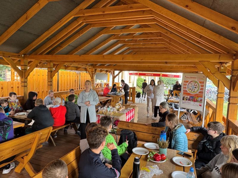 • Grupa dzieci przy stołach pod zadaszeniem drewnianej altany