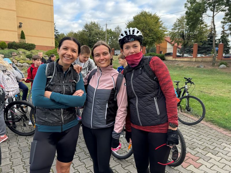 • Trzy kobiety w sportowych strojach. W tle grupa rowerzystów
