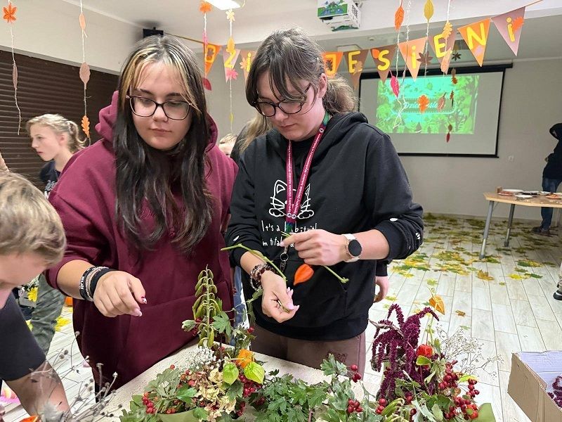 • Długi stół z leżącymi na nim gałązkami, suszonymi liśćmi i kwiatami.Troje uczniów wykonuje stroiki z gałązek liści. Po...
