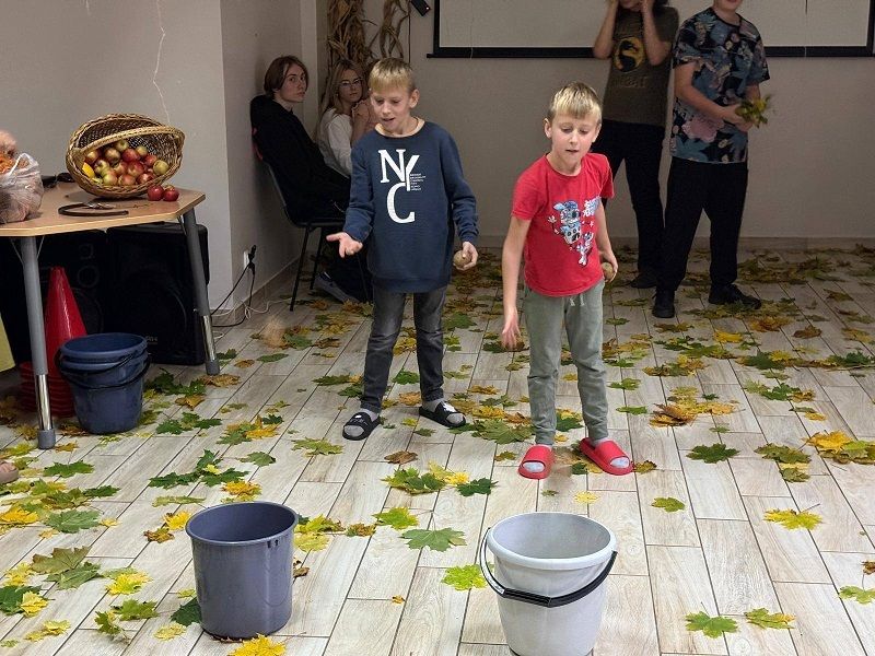 • Dwóch chłopców wrzuca z odległości ziemniaki do siwych wiaderek. Na podłodze porozrzucane suche liście. Po lewej na stole...