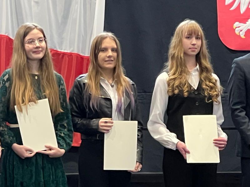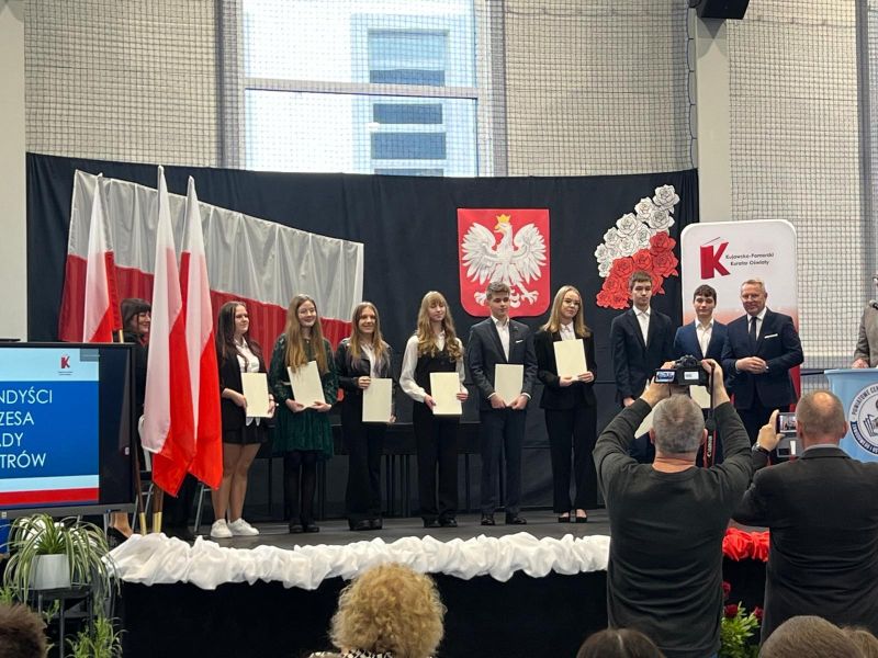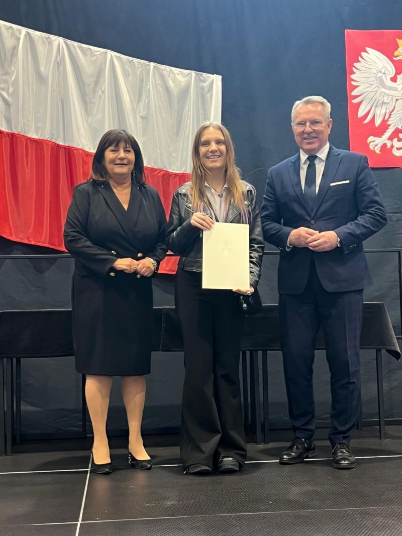 W poniedziałek 17 listopad 2025 roku nasza uczennica Marta Czupajło otrzymała stypendium Prezesa Rady Ministrów z rąk Wicewojewody Kujawsko-Pomorskiego pana Piotra Hemmerlinga i Kujawsko-Pomorskiej Kurator Oświaty w Bydgoszczy pani Grażyny Dziedzic. Uroczystość wręczenia dyplomów odbyła się w Powiatowym Centrum Kształcenia Zawodowego i Ustawicznego w Chodczu. Zarówno Pan Wojewoda, jak i Pani Kurator podkreślili wagę wyróżnienia, którym jest otrzymane stypendium jak również zachęcili do podejmowania dalszych wyzwań. Szczególne słowa uznania skierowano również do rodziców, nauczycieli i dyrektorów szkół i placówek. Marcie składamy serdeczne gratulacje i życzymy dalszych sukcesów.