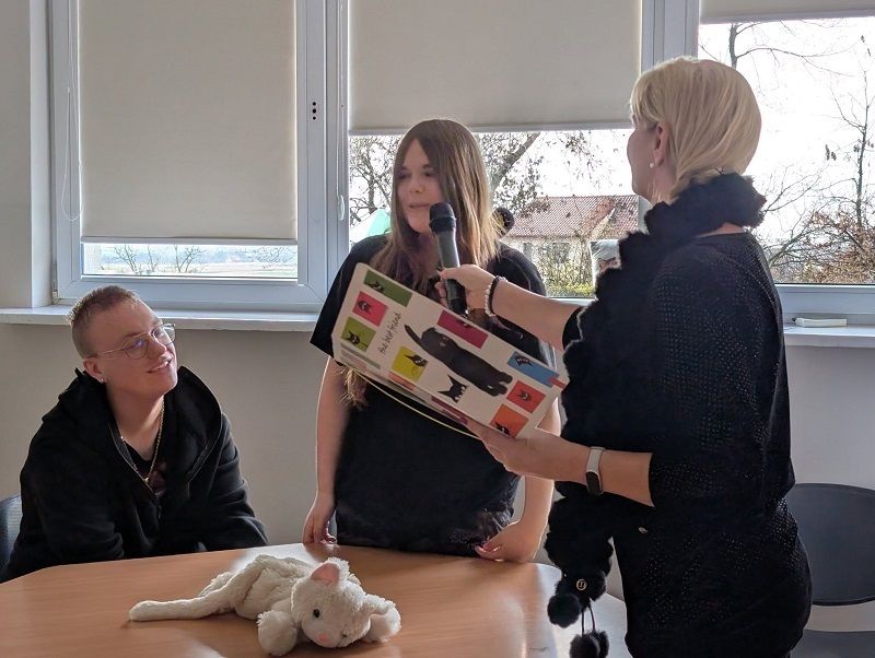 • Dziewczyna z długimi włosami mówi przez mikrofon trzymany przez kobietę z czarnym szalem. Po lewej siedzi chłopak w...