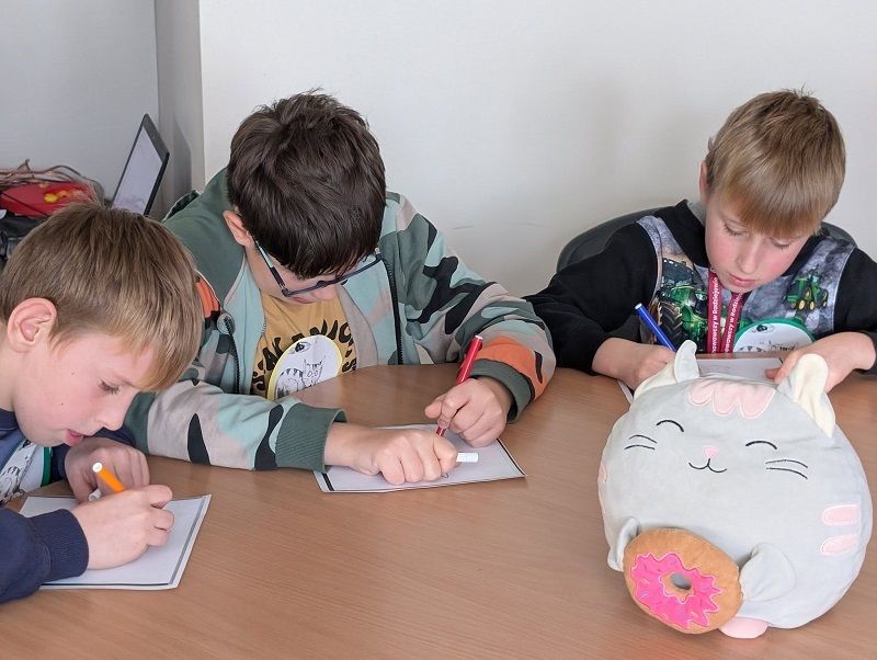 • Trzech uczniów z uwagą maluje kolorowymi pisakami na białych kartkach. Na stole maskotka kot