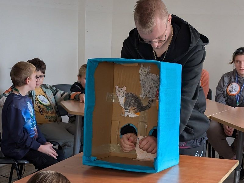 • Uczeń w czarnej bluzie wkłada ręce przez otwory wycięte w niebieskim pudełku. W tle grupa dzieci