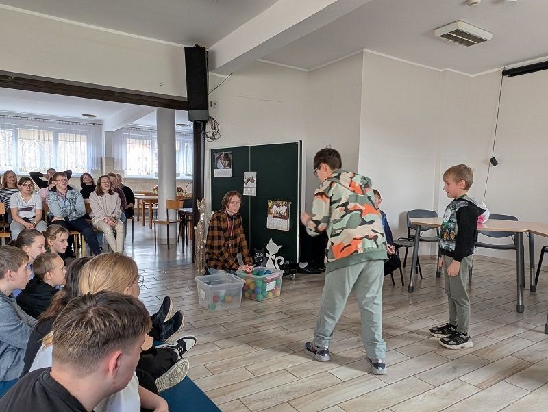 • Uczeń w kolorowej bluzie wrzuca piłeczki do przezroczystych pojemników. Po lewej duża grupa uczniów siedzących na krzesłach...